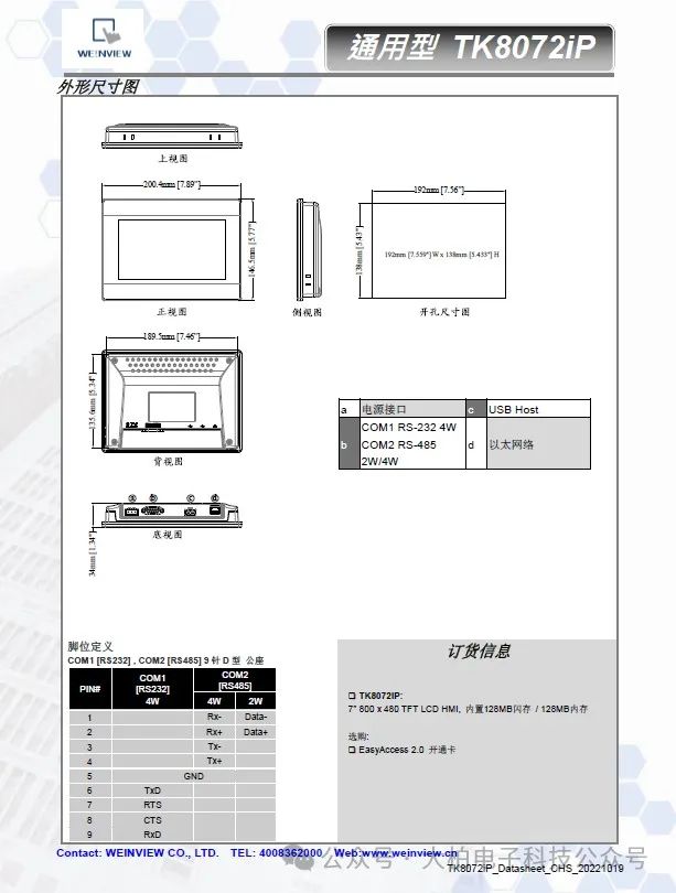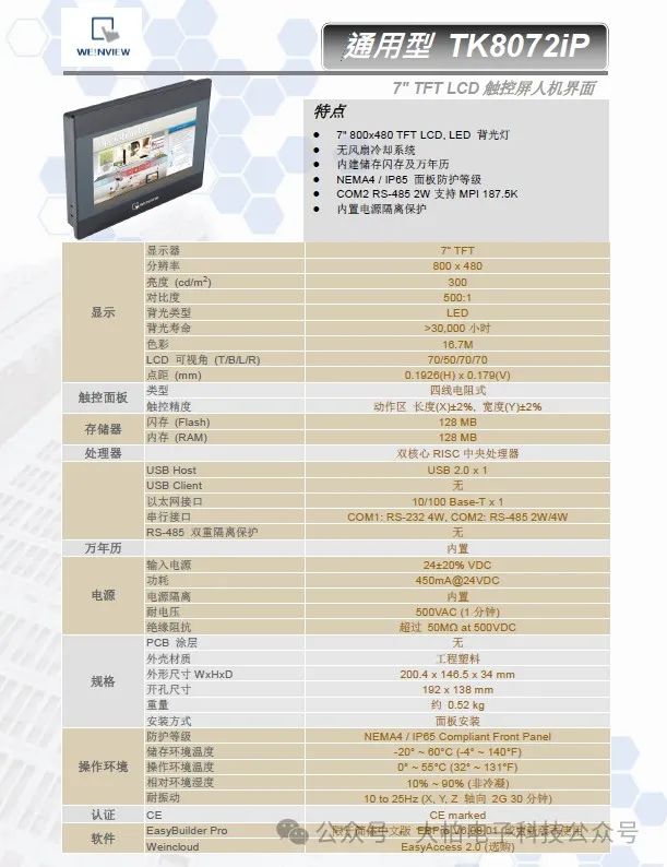 威綸通觸摸屏TK8072IP選型資料、開孔尺寸支持以太網(wǎng)7寸