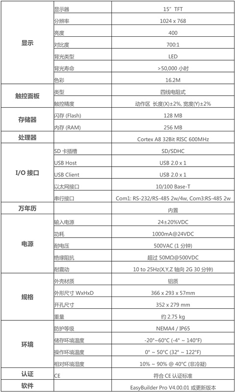 產(chǎn)品特點(diǎn) Installation 15" 1024x768 TFT LCD, LED 背光 無風(fēng)扇冷卻系統(tǒng) 內(nèi)置128MB閃存 支持USB主設(shè)備與USB從設(shè)備 支持SD卡擴(kuò)充儲(chǔ)存容量 COM1/COM3 RS485 內(nèi)置隔離器 COM1及COM3 RS485 2W 支持MPI 187.5K同時(shí)間請(qǐng)選擇一使用 內(nèi)置電源隔離器 NEMA4/IP65 前面板防護(hù)等級(jí)